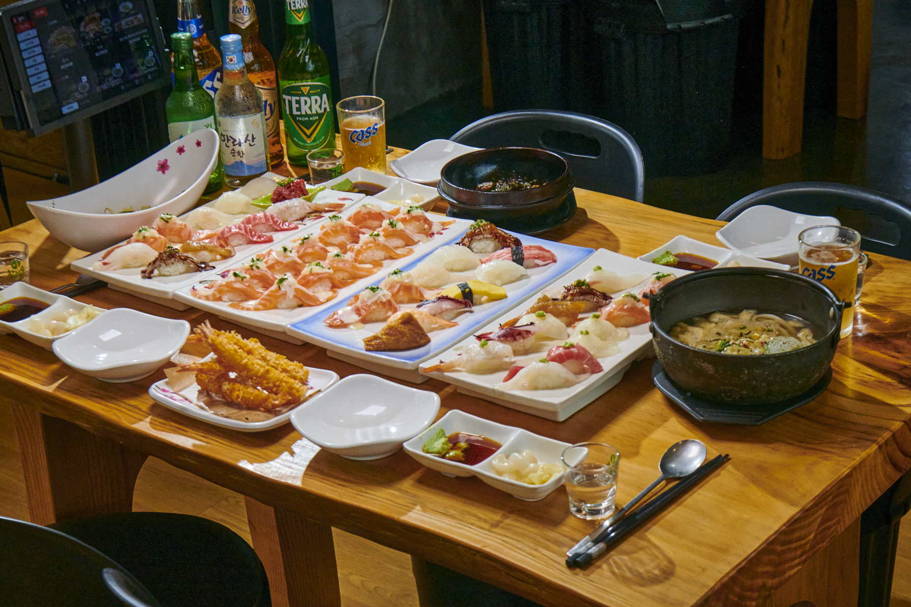 스시혼 제주에 들어서는 순간, "오?" 소리가 절로 나왔습니다. '가성비 맛집'이라고 해서 혹시 허름할까 했는데, 웬걸요. 넓고 깔끔한 인테리어에 따뜻하고 아늑한 분위기까지, 첫인상부터 제대로였습니다. 1층은 시원하게 트인 홀이었고, 2층은 룸으로 되어 있어서 가족 모임이나 데이트 코스로도 손색없겠더군요.